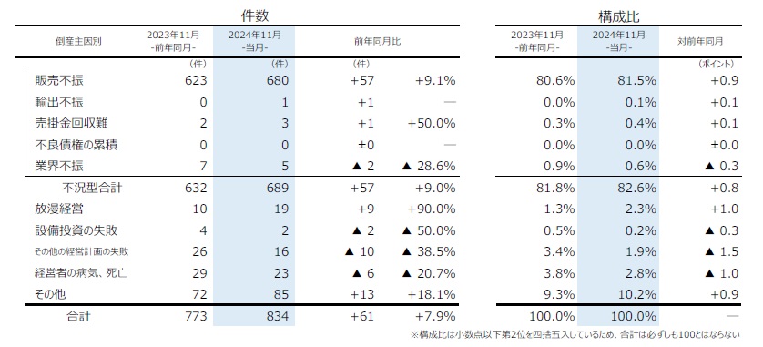 主因別では、「販売不振」が680件(前年同月623件、9.1%増)で、全体の81.5%を占める。「売掛金回収難」「業界不振」も合わせた「不況型倒産」が、31か月連続で前年同月を上回っている。