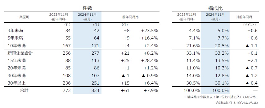 業歴別では、「30年以上」251件(前年同月236件、6.4%増)が最多。一方業歴10年未満の「新興企業」277件(前年同月256件、8.2%増)も33.2%を占め、過去3番目の高水準となっている。