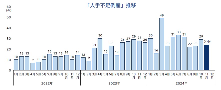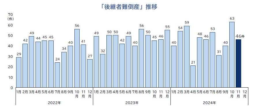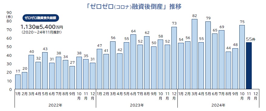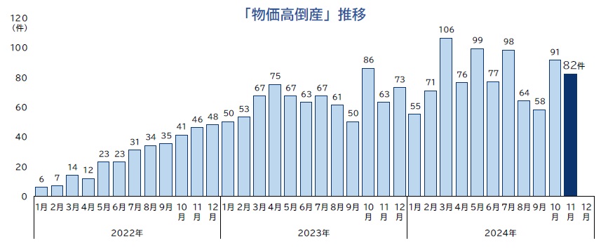そのほか要因別で見ると、「ゼロゼロ(コロナ)融資後倒産」は55件発生し、1~11月累計は682件で過去最多。「人手不足倒産」は24件発生し、年間件数は初めて300件を超え過去最多。「後継者難倒産」は46件発生し、年間件数は2年連続で500件超。「物価高倒産」は82件発生し、年間件数877件で過去最多となっている。
