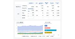 「TVer」「YouTube」「Facebook」「Instagram」「X」「TikTok」など、異なるプラットフォームごとにバラバラの「視聴」の定義を統一。テレビCMを含めた全広告を視聴回数や視聴単価などの共通指標で横断的に比較・評価できる。視聴回数やリーチの推移を期間ごとに比較できるだけでなく、売上、Webコンバージョン、来店者数などの成果データを並べて表示するので、広告効果との相関関係を視覚的に把握できる。