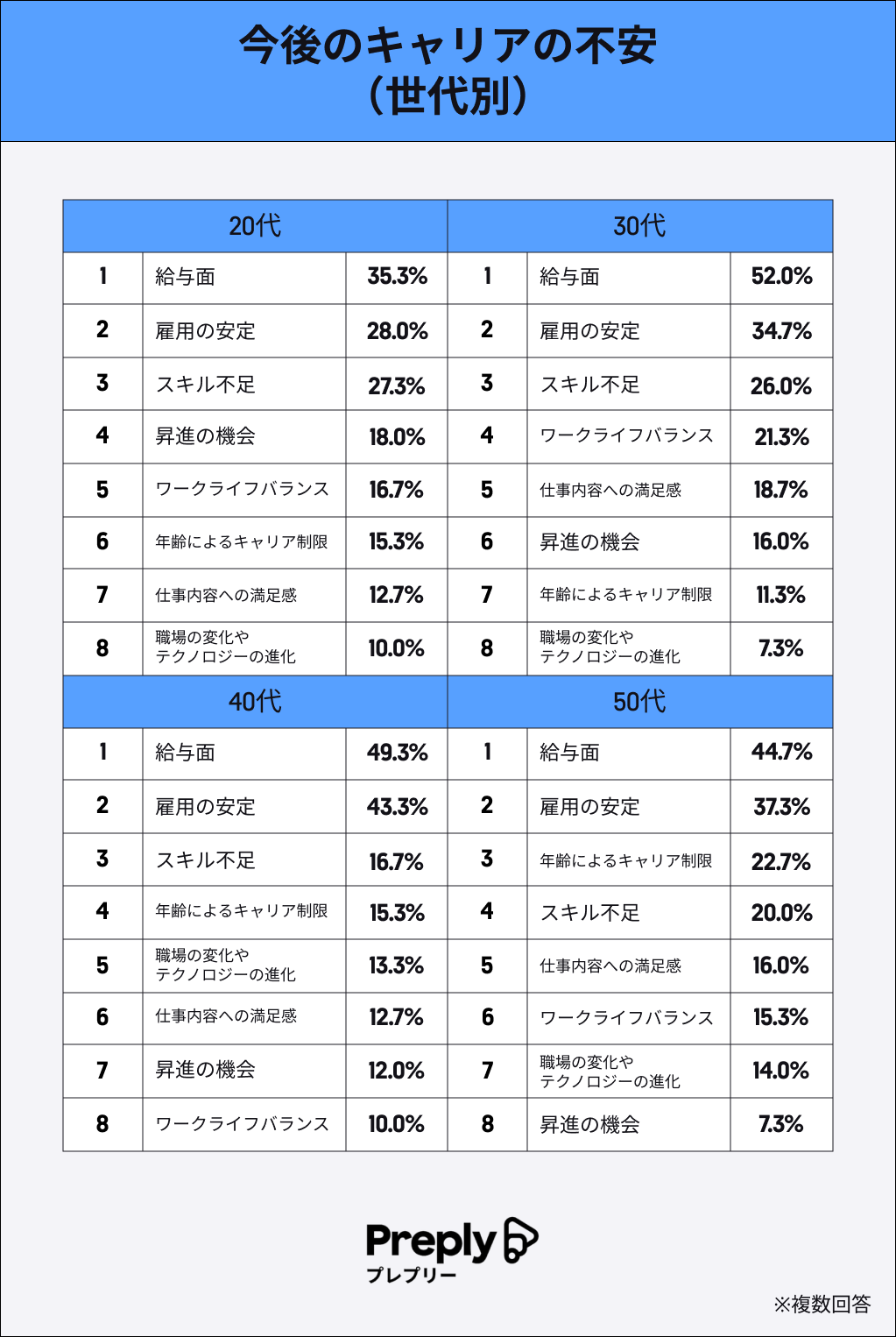 今後のキャリアに対する不安としては、30代の半数以上が「給与面」に不安を感じていると回答。「ワークライフバランス」との回答も多く、ライフステージの変化に伴い、働き方について悩んでいる人も多いようだ。一方で、20代は「給与面」が比較的少なく、50代は「年齢によるキャリア制限」が多かった。