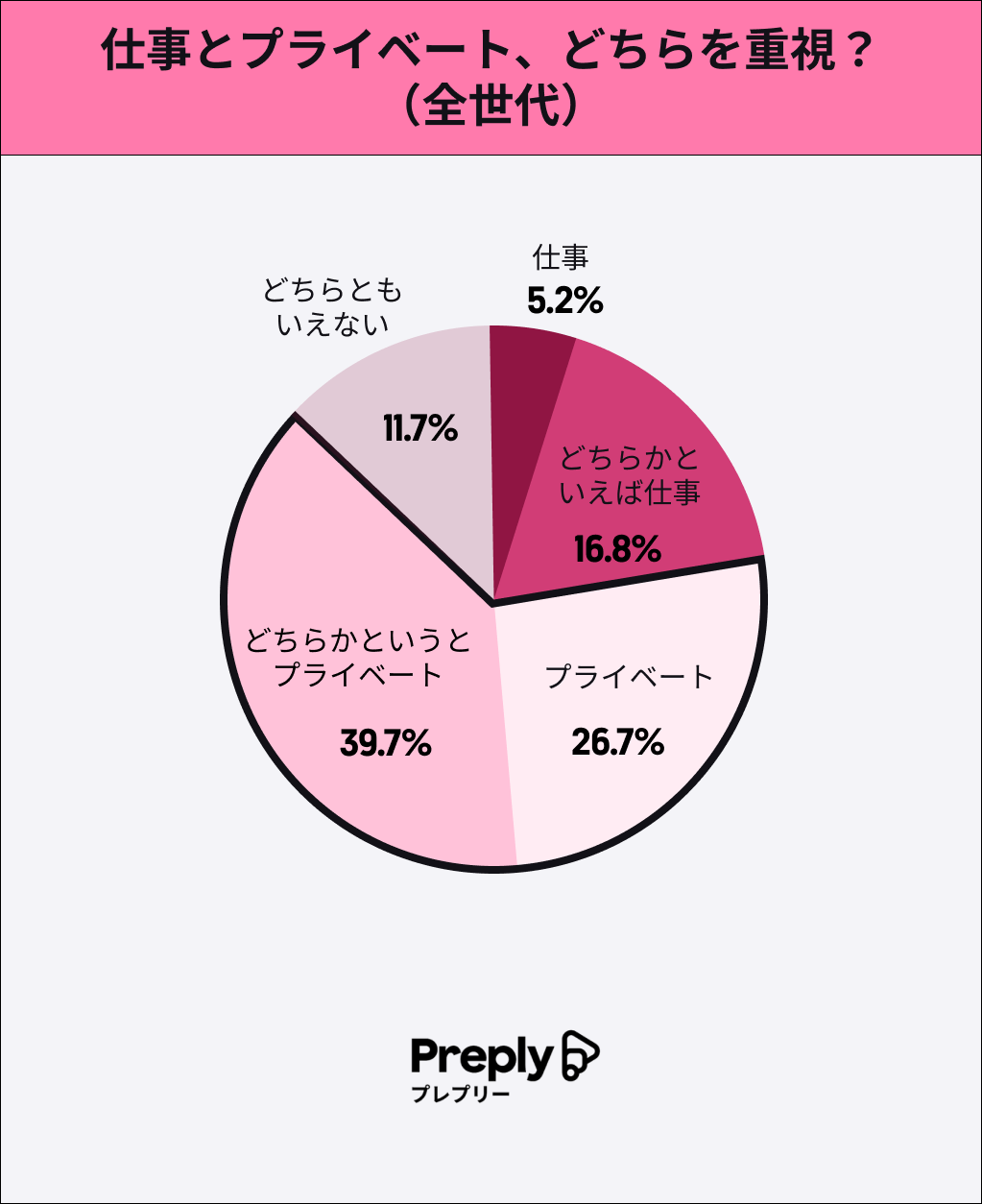 仕事とプライベートのどちらを重視するかという質問では、全体では「プライベート・どちらかといえばプライベート」が66.4%を占めた。年代別に見ると、50代は仕事重視の割合が他世代に比べてやや多かった。