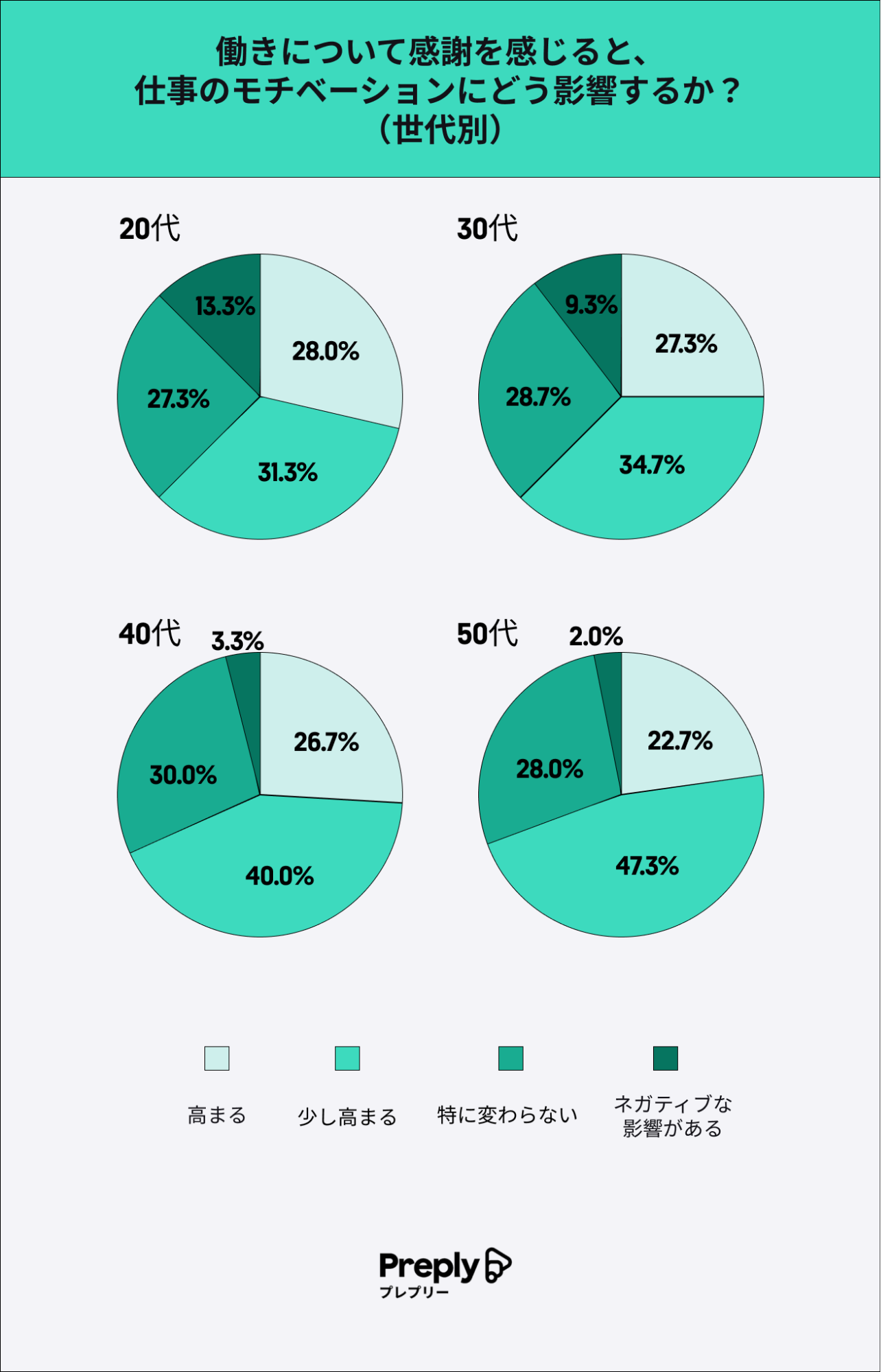 続いて、仕事の働きについて感謝されたとき、モチベーションにどう影響するかを聞くと、「モチベーションが高まる」の割合は若い世代ほど少なくなることがわかった。特に20代は「ネガティブな影響がある」が13.3%と比較的高かった。