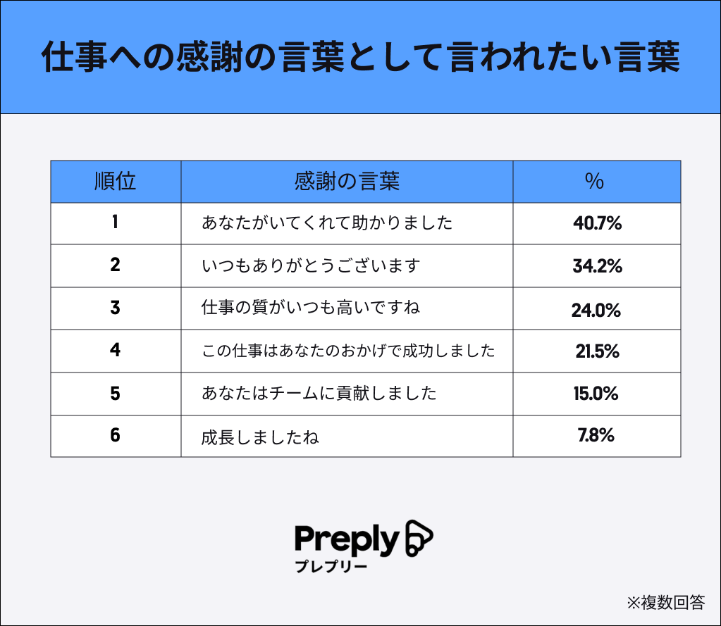 仕事への感謝として言われたい言葉としては、「あなたがいてくれて助かりました(40.7%)」「いつもありがとう(34.2%)」など、誰かの役に立てたと感じるような誉め言葉が上位となった。