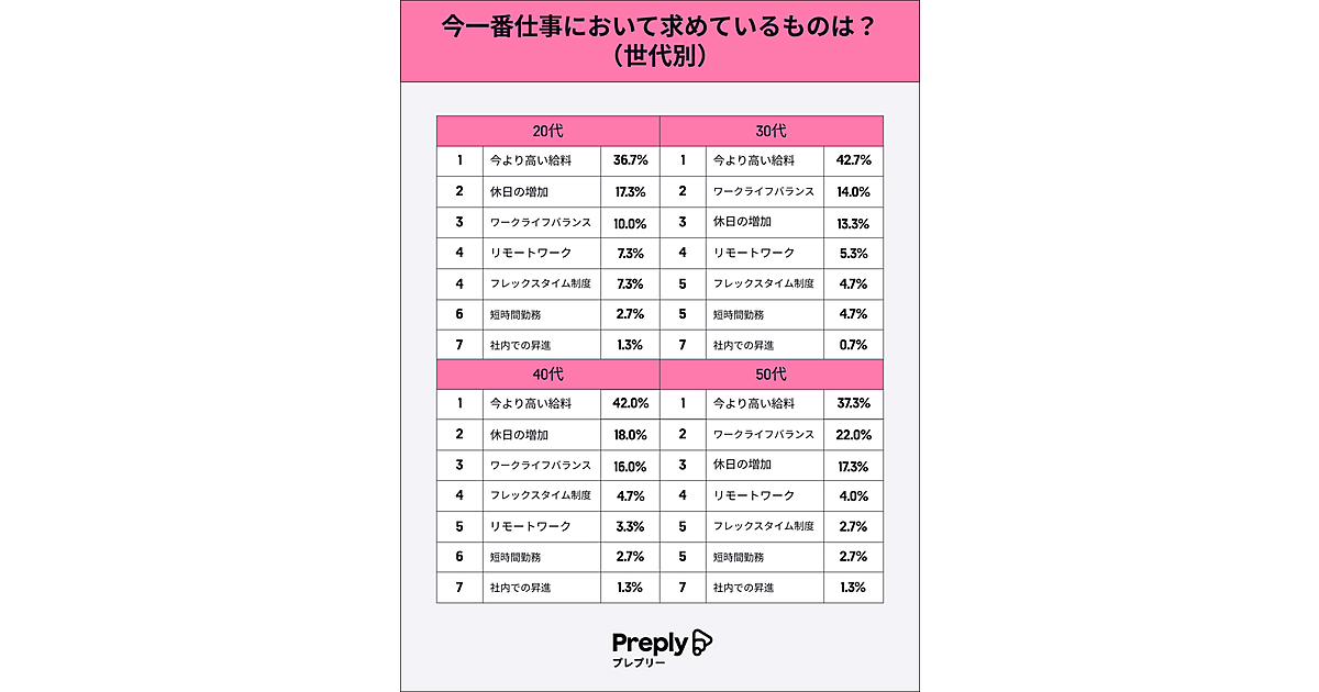 世代別に見ると、30代と40代が特に「今より高い給料」と回答した割合が高く、20代では「リモートワーク」「フレックスタイム制度」など自由な働き方を求める人が他の年代よりも多い傾向だった。
