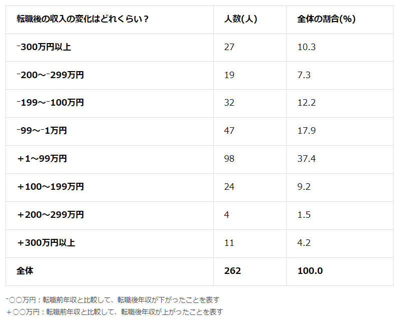 「TOSHO転職ONLINE」を運営する東晶貿易は、「転職前の年収と転職後の年収の変化」に関する調査結果を発表した。22歳~55歳の転職経験がある男女262人が回答している。