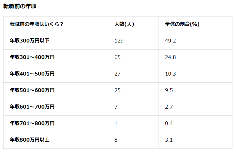 あわせて「転職前の年収」を聞くと、「年収300万円以下」49.2%が最多。以下「年収301万円~400万円」24.8%、「年収401万円~500万円」10.3%が続く。やはり転職によって年収を上げたいという人も多いと思われる。