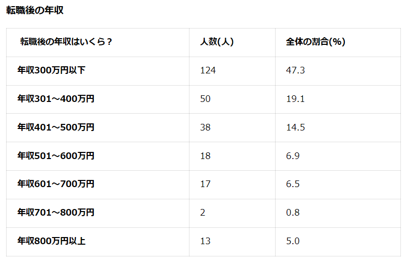 一方「転職後の年収」は、「年収300万円以下」47.3%が最多で、「年収301万円~400万円」19.1%、「年収401万円~500万円」14.5%が続き、ほぼ状況は変わらない。転職で年収が上昇するとは限らず、年収が下がるケースも多いようだ。