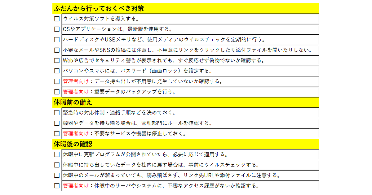 こうした背景からIPAでは、利用者・管理者双方に向けて注意を呼びかけている。これらは大きくは、「ふだんから行っておくべきセキュリティ対策」、トラブル発生時の連絡方法を事前調整するといった「休暇前の備え」、不審なアクセスや侵入の痕跡がないかチェックするといった「休暇後の確認」に分かれる。以下、チェックリストを作成したので活用してほしい。