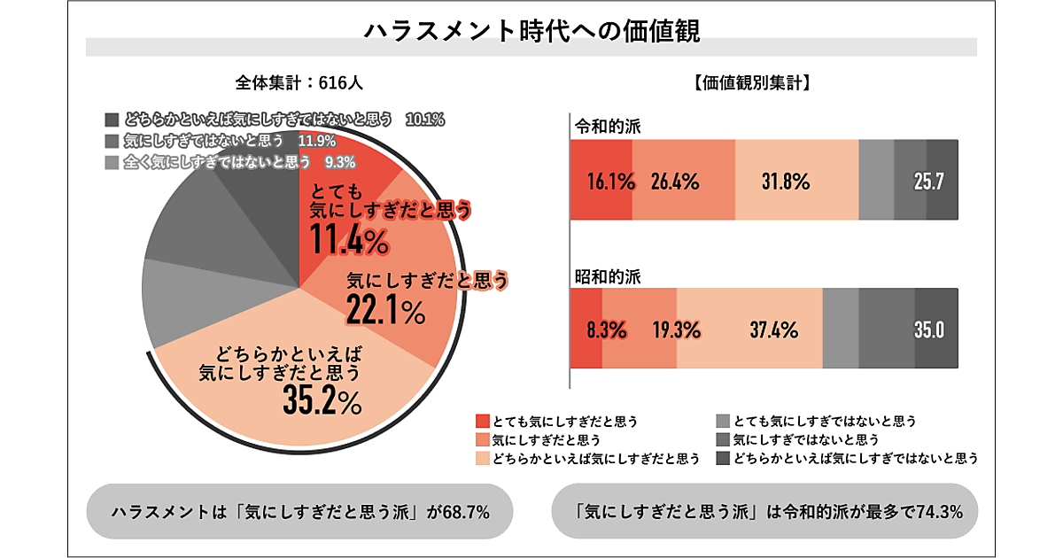 ハラスメントの種類が増えている時代に対し、どう思っているかを聞くと、「気にしすぎだと思う派」が68.7%を占めていた。価値観別に聞くと、令和的派の74.3%、昭和的派の65.0%が「気にしすぎ」と回答していた。