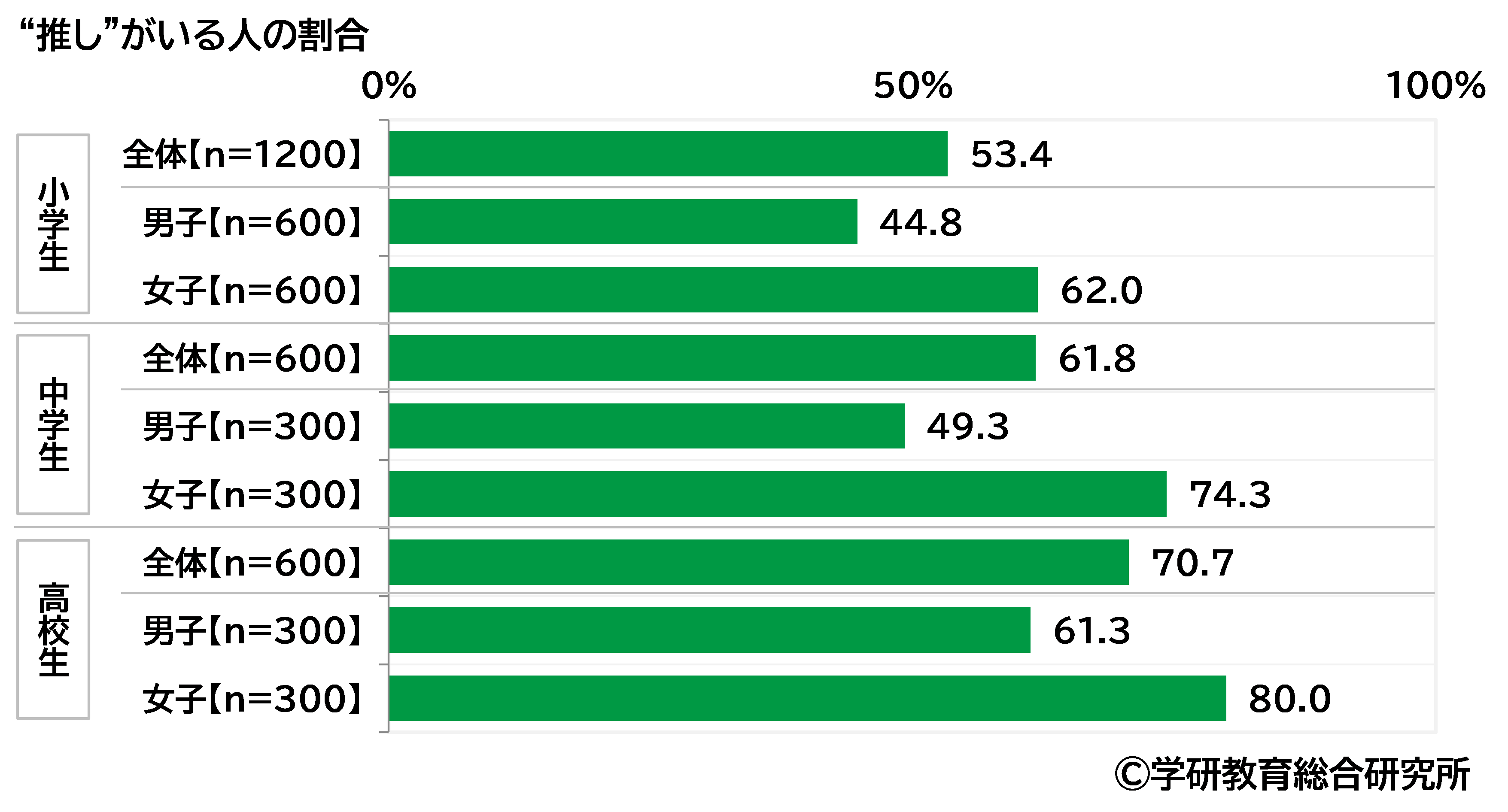続いて、“推し”がいるかどうかを聞いたところ、小学生では53.4%、中学生では61.8%、高校生では70.7%が「いる」と回答。男女別では、小中高生のいずれにおいても、男子よりも女子のほうが15ポイント以上高い結果となった。