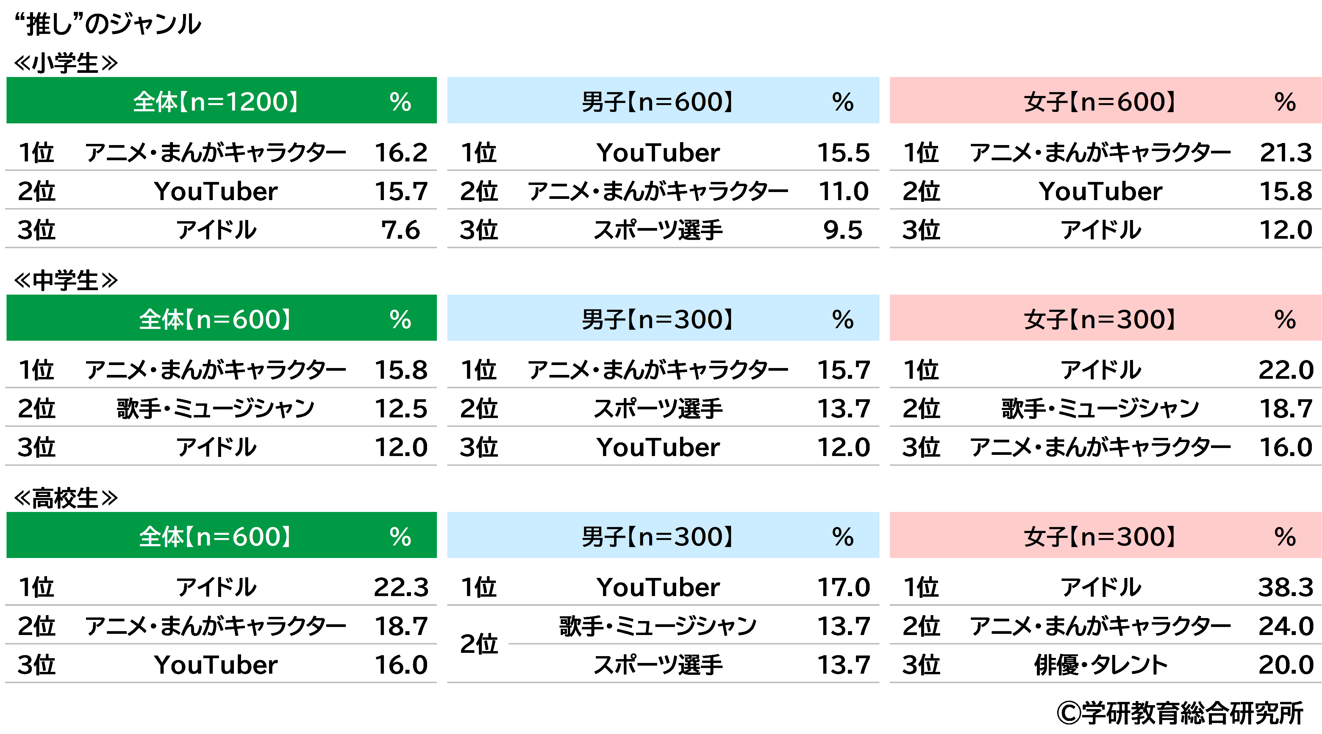 “推し”のジャンルとしては、小学生男子と高校生男子は「YouTuber」、中学生女子と高校生女子は「アイドル」、小学生女子と中学生男子は「アニメ・まんがキャラクター」がそれぞれ1位となった。