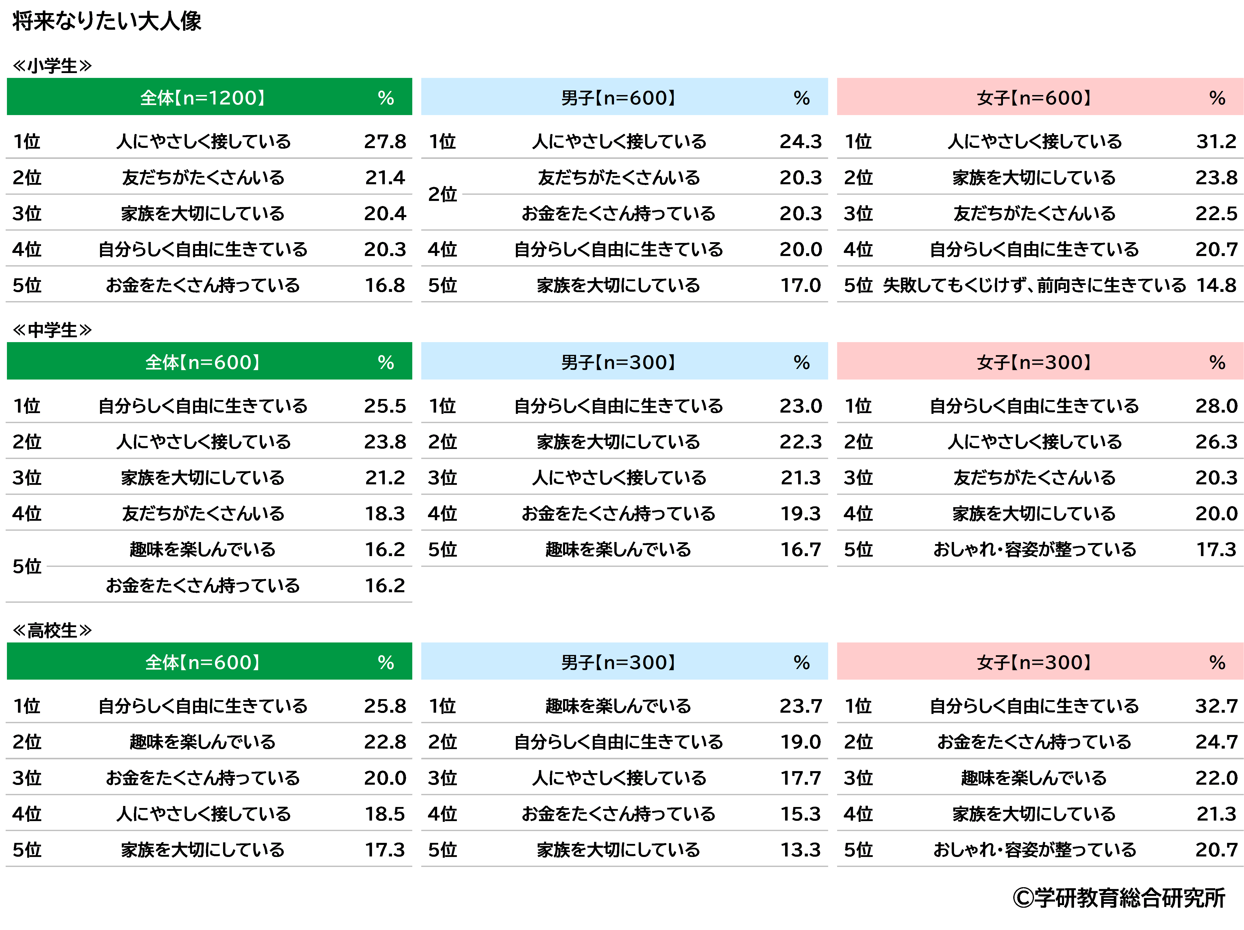最後に、将来どんな大人になりたいかを聞くと、小学生では「人にやさしく接している」「友だちがたくさんいる」が上位となり、中高生では「自分らしく自由に生きている」がトップとなった。男女別に見ると、高校生男子・女子の「趣味を楽しんでいる」の割合に違いが見られた。