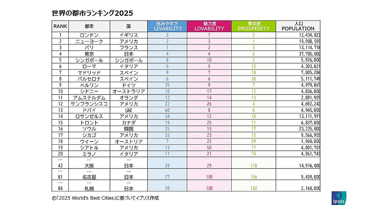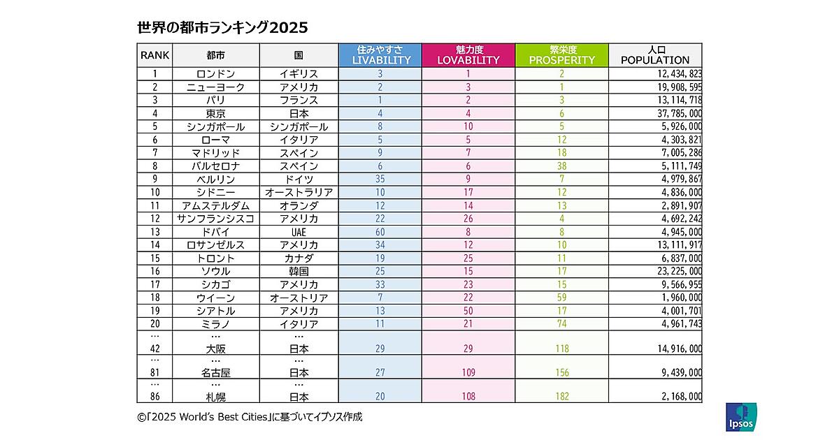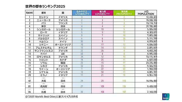 イプソス(Ipsos)は、「世界のベスト都市ランキング(2025 World's Best Cities)」を発表した。観光、不動産、経済開発の大手コンサルタント会社であるレゾナンスがレポートを作成した。