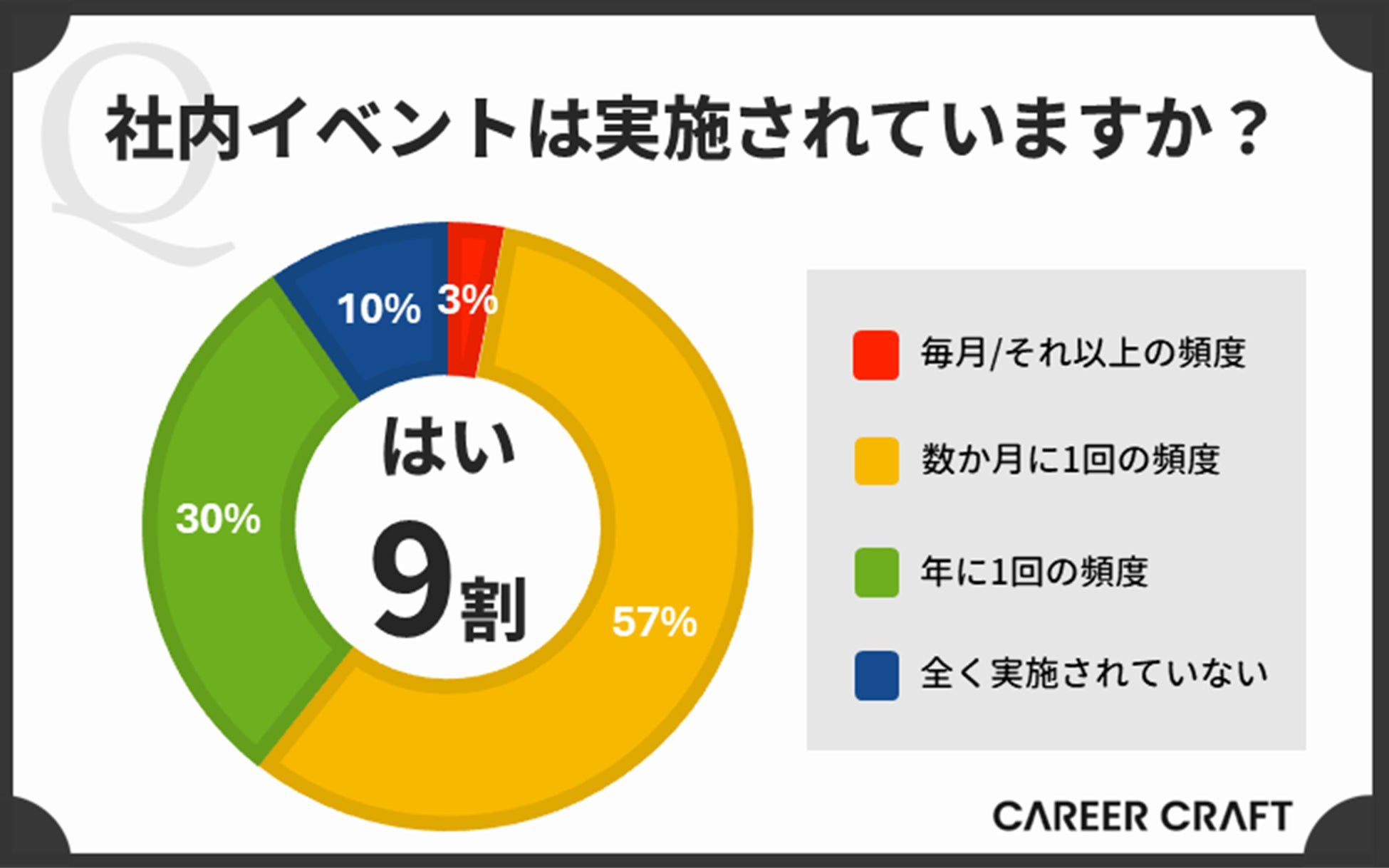 まず、自社で社内イベントを実施しているかを聞くと、合計で90%が「実施している」と回答。内訳としては、「数カ月に1回の頻度」が57%で最も多かった。