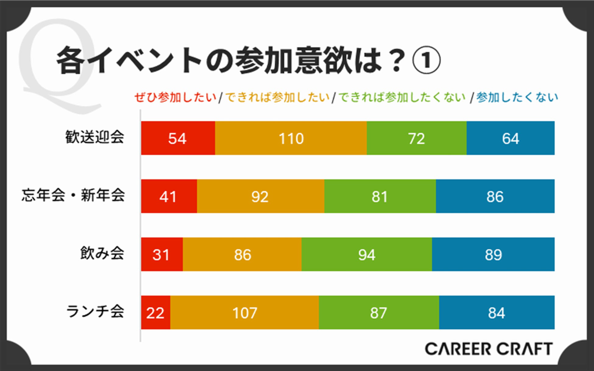 各イベントの参加意欲としては、「歓送迎会」「忘年会・新年会」「飲み会」「ランチ会」などの飲食を伴うイベントは、比較的参加意欲が高い結果に。ぜひ参加したい・できれば参加したいの合計が最も多かったのは「歓送迎会」だった。