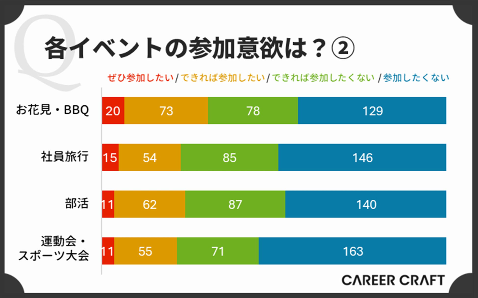 一方で、「社員旅行」「運動会・スポーツ大会」「お花見・BBQ」「部活」などの拘束時間が長いイベントは参加意欲が低い傾向に。特に、「社員旅行」「運動会」は約半数が「参加したくない」と回答していた。