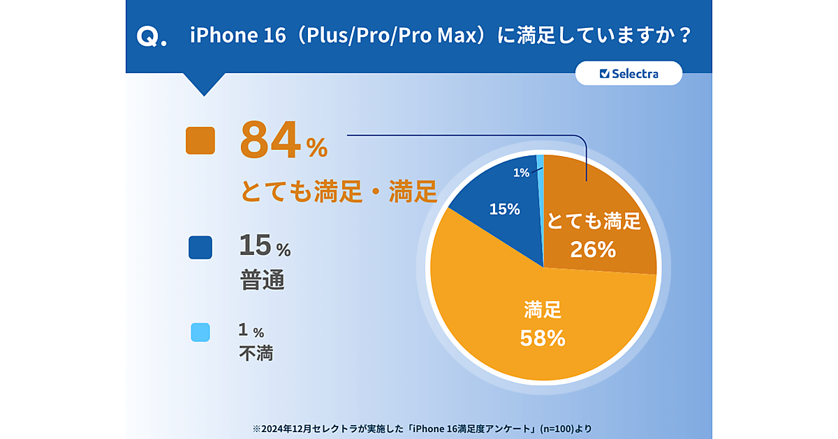 セレクトラ・ジャパンは、「新型iPhone16への満足度」に関する調査結果を発表した。2024年9月20日に発売されたiPhone 16シリーズ(無印、Plus、Pro、ProMax)を購入した男女100人が回答している。