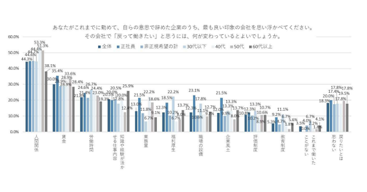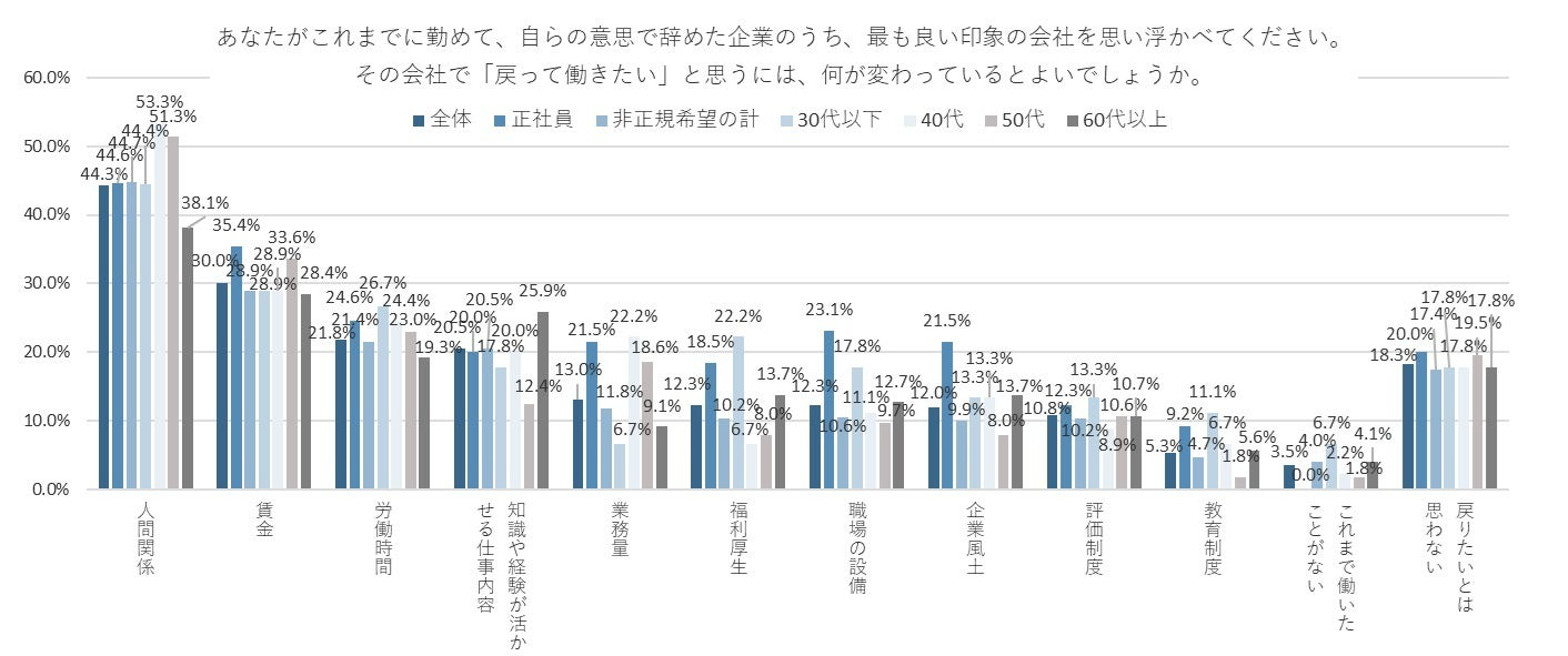 まず、過去働いていた職場について、「戻って働きたい」と思うには何が変わっているとよいかを聞くと、全体では「人間関係」が44.3%で圧倒的に多く、ついで「賃金」が30.0%、「労働時間」が21.8%となった。年代別にみると、40代、50代の半数以上が「人間関係」を選択しており、退職の理由として大きいことがうかがえた。