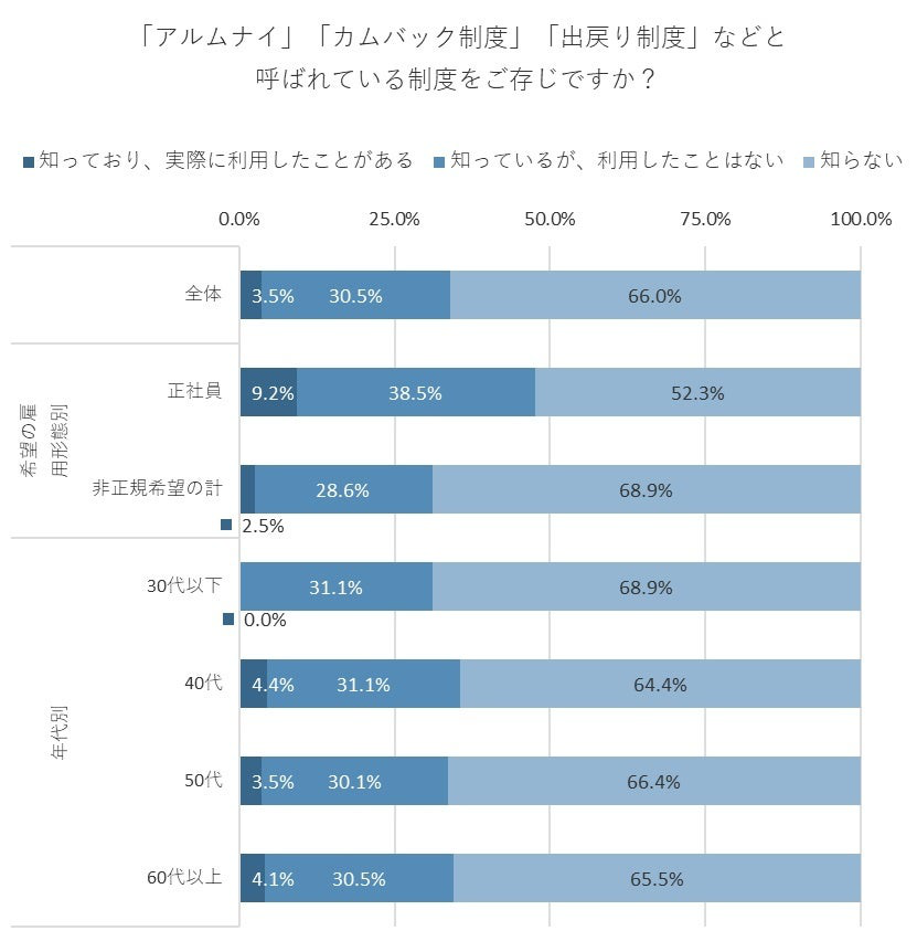また、「アルムナイ」「カムバック制度」「出戻り制度」など、一度退職した従業員を再度採用する制度についての認知度を聞くと、全体では「知らない」が66.0%で多数派に。「知っており、実際に利用したことがある」は3.5%にとどまった。年代別では、特に30代以下において認知度が低く、実際の利用者はいなかった。