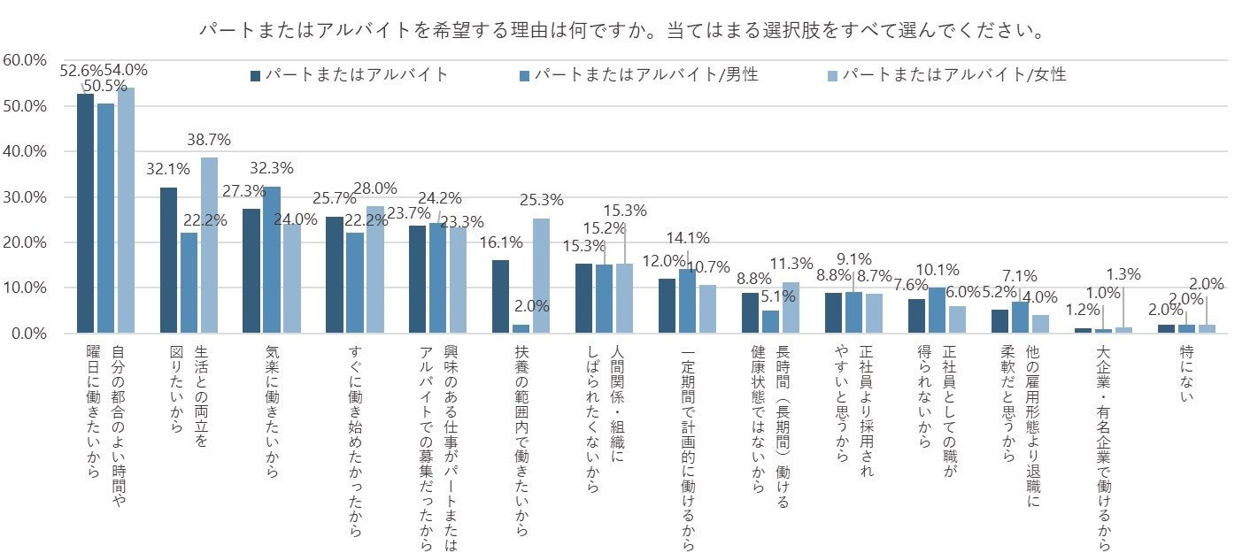 パートまたはアルバイトの働き方を希望する人に対し、その理由を聞くと、「自分の都合のよい時間や曜日に働きたいから」が52.6%で最多に。男女別に見ると、女性では「扶養の範囲内で働きたいから」「生活との両立を図りたいから」が男性の割合を大きく上回っていた。