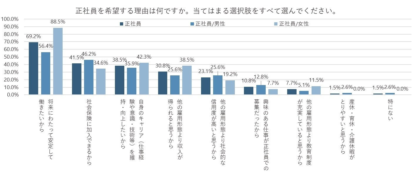 一方で、正社員を希望する理由を聞くと、「将来にわたって安定して働きたいから」が69.2%で最も多く、「社会保険に加入できるから」が41.5%と続いた。男女別に見ると、男性は「社会保険に加入できるから」「社会的な信用度」の項目が高く、女性は「将来にわたって安定して働きたいから」が高かった。