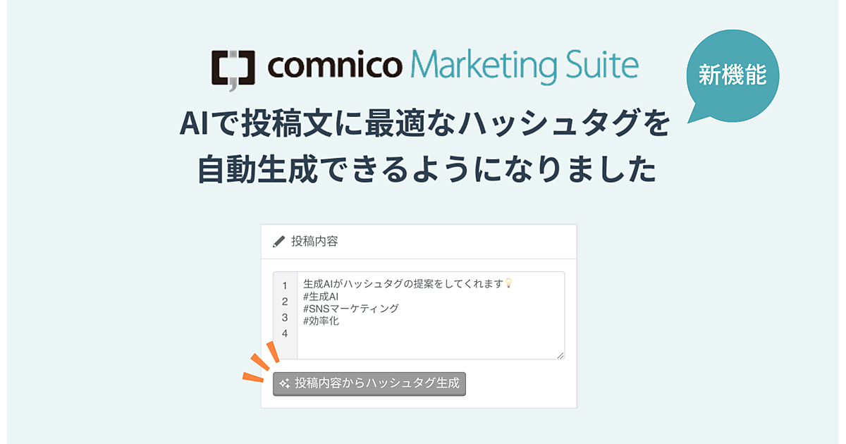 SNSマーケティング支援事業のコムニコは、同社が展開するSNS運用効率化ツール「コムニコマーケティングスイート」に、ハッシュタグ(#)の自動生成機能を加えた、と1月7日発表した。SNSへの投稿を作成する際、内容に合わせて最適なハッシュタグをAI(人工知能)が自動で生成。AIの活用でハッシュタグの作成作業を軽減し、業務が効率化できる。