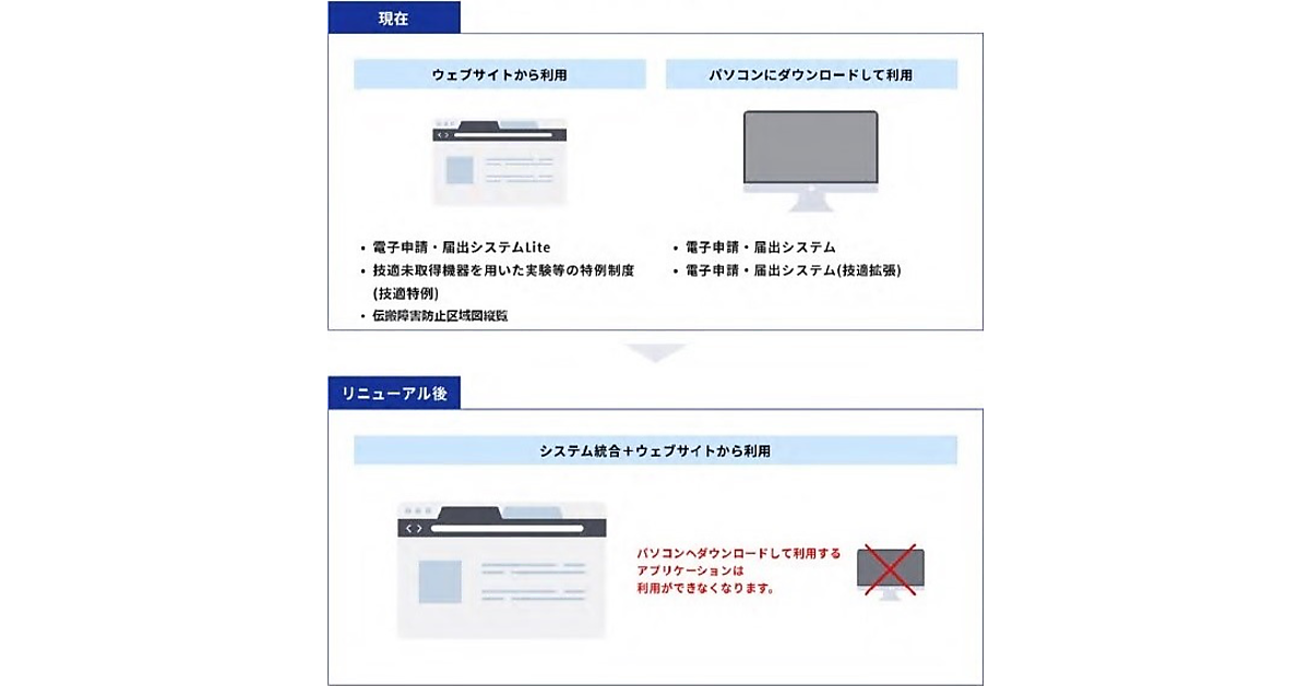 ①電子申請・届出システム②電子申請・届出システムLite③技適用電子申請・届出システム④技適未取得機器を用いた実験等の特例制度⑤伝搬障害防止区域図縦覧--がウェブサイトから使える。これまでは①と③はパソコンにダウンロードしなければ利用できなかった。リニューアルで①と③はアプリケーションでは使えなくなる。