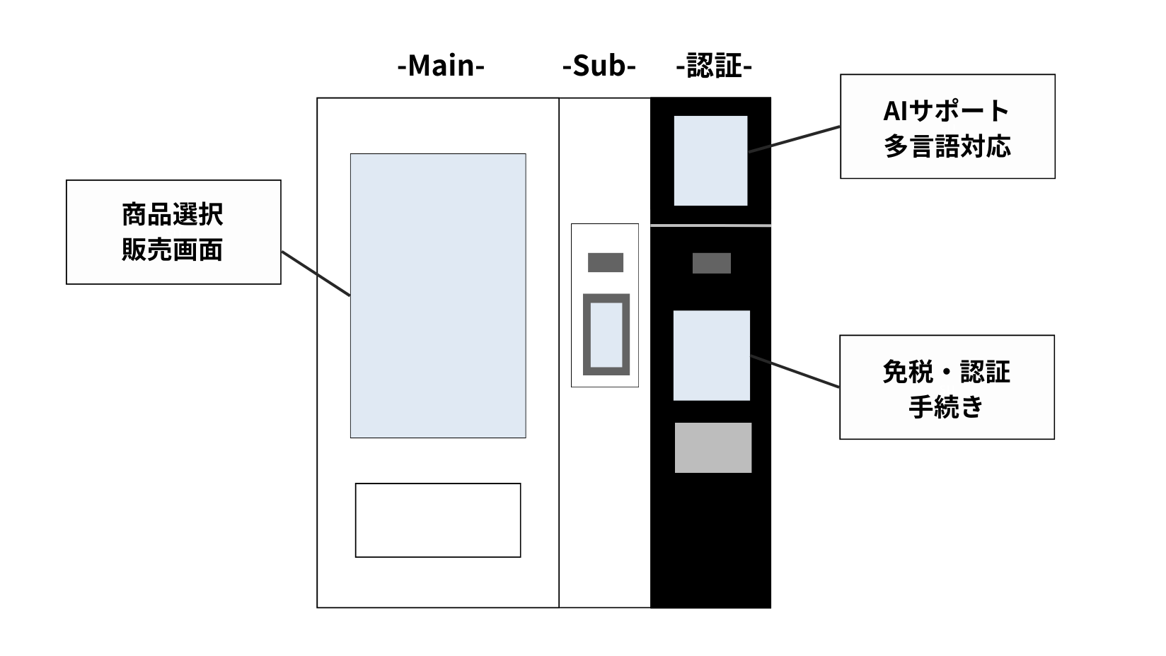 生成AI免税対応自動販売機は、モニターを通じてアバターが接客することで消費税の免税を無人で可能にする免税販売機能を搭載した世界初という自販機。24時間365日対応できるため、観光地の人手不足解消につながる。利用者は免税を受けるためスキャナでのパスポート読み取りや顔認証の必要があり、対話エージェントが音声で手続きを支援する。