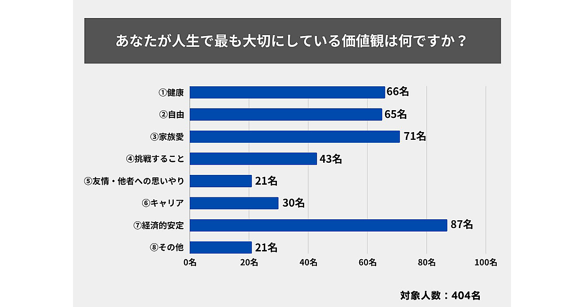 まず、人生で最も大切にしている価値観について聞くと、「経済的安定」が最も多く、以下「家族愛」「健康」「自由」がほぼ同数で並んだ。