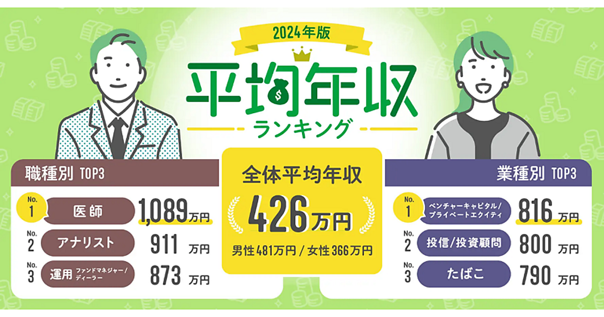 パーソルキャリアが運営する転職サービス「doda(デューダ)」は、「平均年収ランキング2024」を発表した。dodaサービスに登録している約60万人のデータを元に、正社員の20歳~65歳ビジネスパーソンの平均年収(支給額)を集計している。