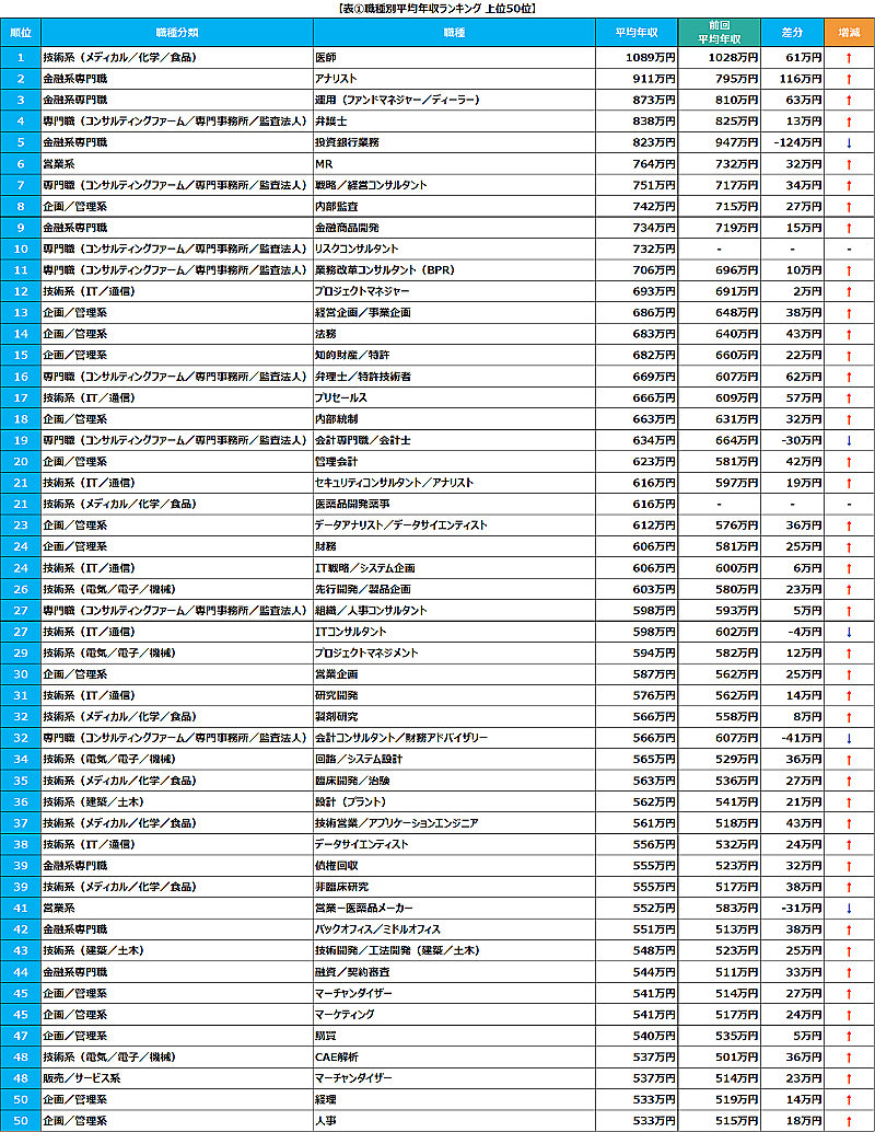 職種別で見ると、全173職種の平均年収ランキング1位は「医師」(1,089万円、技術系)だった。以下「アナリスト」911万円、「運用(ファンドマネジャー/ディーラー)」873万円が続く。5位に「投資銀行業務」、9位に「金融商品開発」も入っており、職種分類では「金融系専門職」がトップ10のうち4つを占めた。