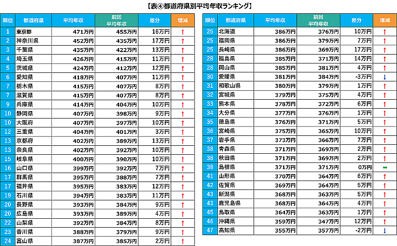 年代別で平均年収を見ると、「20代」360万円、「30代」451万円、「40代」519万円、「50代以上」607万円で、全年代で前年よりも平均年収がアップしている。都道府県別では、47都道府県のうち44都道府県で年収がアップしたが、「島根県」は変化なし、「愛媛県」「高知県」は減少だった。