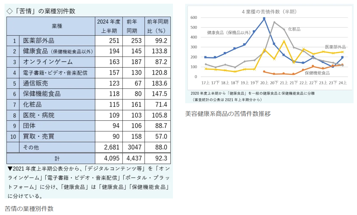 苦情の内容を業種別に見ると、「医薬部外品」が251件で最も多く、以下「健康食品(保健機能食品以外)」、「オンラインゲーム」と続いた。上位の項目で特に増加が目立ったのは「健康食品(保健機能食品以外)」で、前年同期比133.8%となり、特に精力増強をうたうものが急増した。