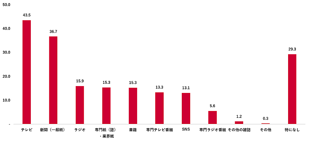 まず「情報の信用度が高いメディア」を聞くと、「テレビ」43.5%が最多で、2位「新聞(一般紙)」36.7%を上回った。3位は「ラジオ」15.9%で大きく数値が下がる。さらに「SNS」については、「専門紙・業界紙」「書籍」「専門テレビ番組」を下回り、13.1%で6位にとどまった。