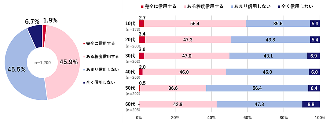 あらためて「SNSの情報を信用するか」と聞くと、「完全に信用する」1.9%、「ある程度信用する」45.9、「あまり信用しない」45.5%、「全く信用しない」6.7%と、信用する派・信用しない派にほぼ分かれた。年代別で見ると、若年層において信用する割合が高く、10代では約6割に達している。