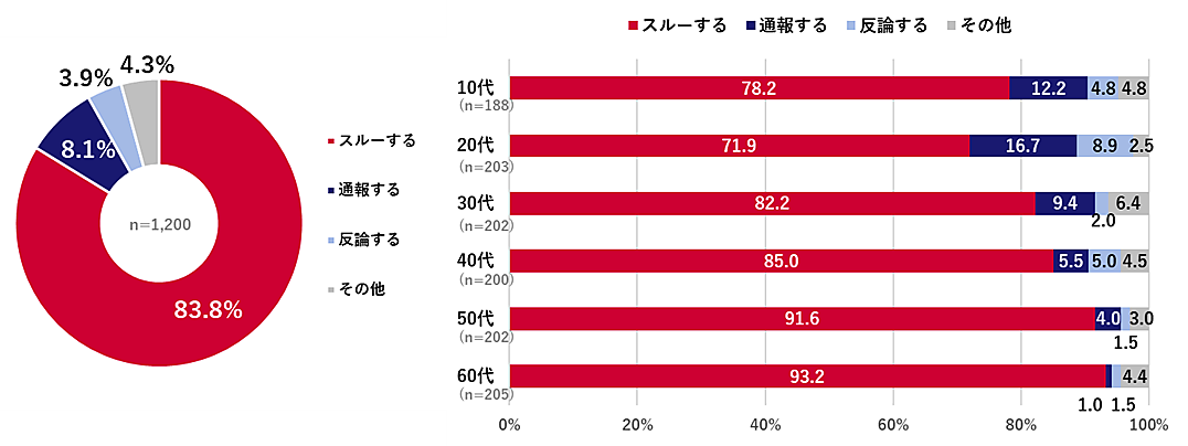 また「SNSでデマ情報を見かけたとき、どのような行動を取るか」では、全体の83.8%が「スルーする」とし、「通報する」「反論する」は1割未満だが、年代別だと20代は「通報する」が16.7%と他の年代よりも高かった。10代も似た傾向で、デマには決然と対応する様子がうかがえる。