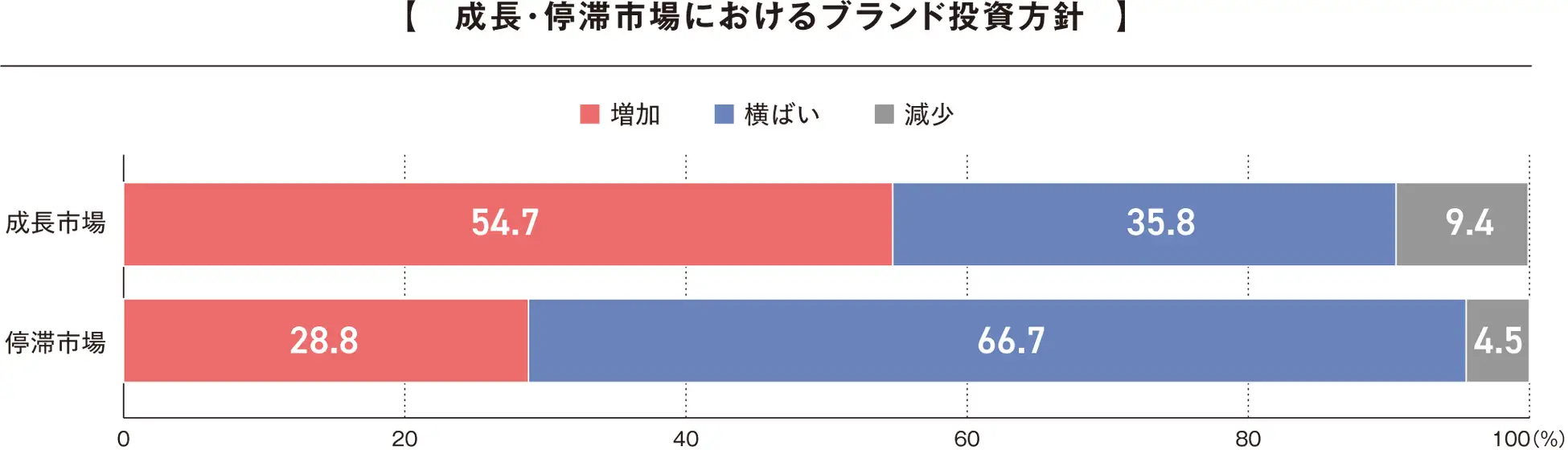 まず、今年度のブランド投資方針について聞くと、自社の市場を成長市場と捉える企業においては「増加」が54.7%と最も高く、「横ばい」が35.8%となった。また、自社の市場を停滞市場と捉える企業では「横ばい」が66.7%と圧倒的だった。