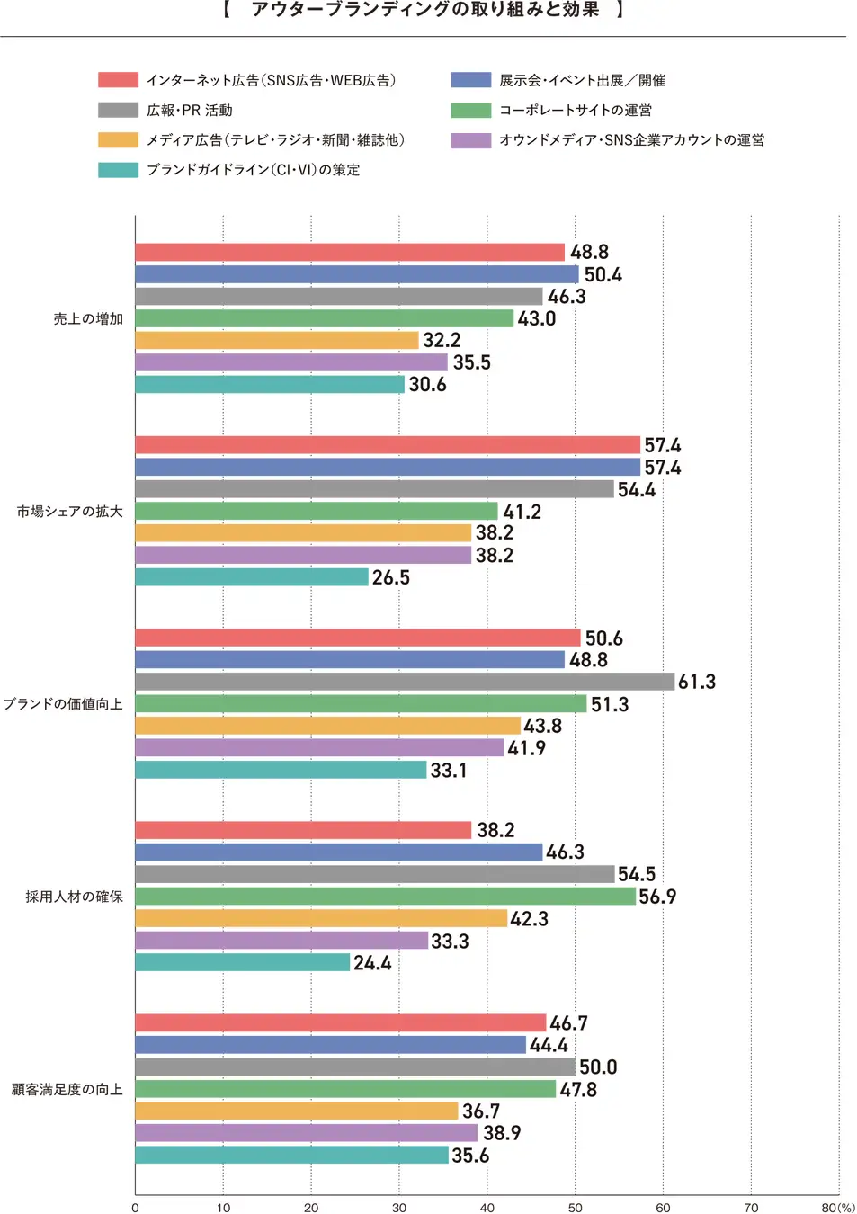 アウターブランディング(社外へのブランディング)における取り組みを聞くと、売上の増加に効果があった施策は「インターネット広告」が48.8%、「展示会・イベント出展」が50.4%で上位に。ブランド価値向上では「広報・PR活動」、採用人材の確保では「コーポレートサイトの運営」が効果的だった。