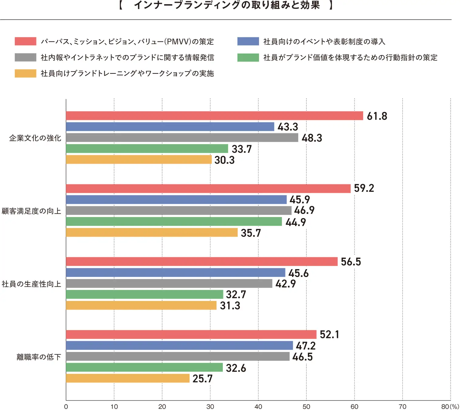 続いてインナーブランディング(社内へのブランディング)における取り組みを聞くと、企業文化の強化や顧客満足度の向上といった全項目において、「パーパス、ミッション、ビジョン、バリュー(PMVV)の策定」が効果的であることがわかった。また、「社員向けイベントや表彰制度」は、離職率の低下や生産性の向上に寄与していた。