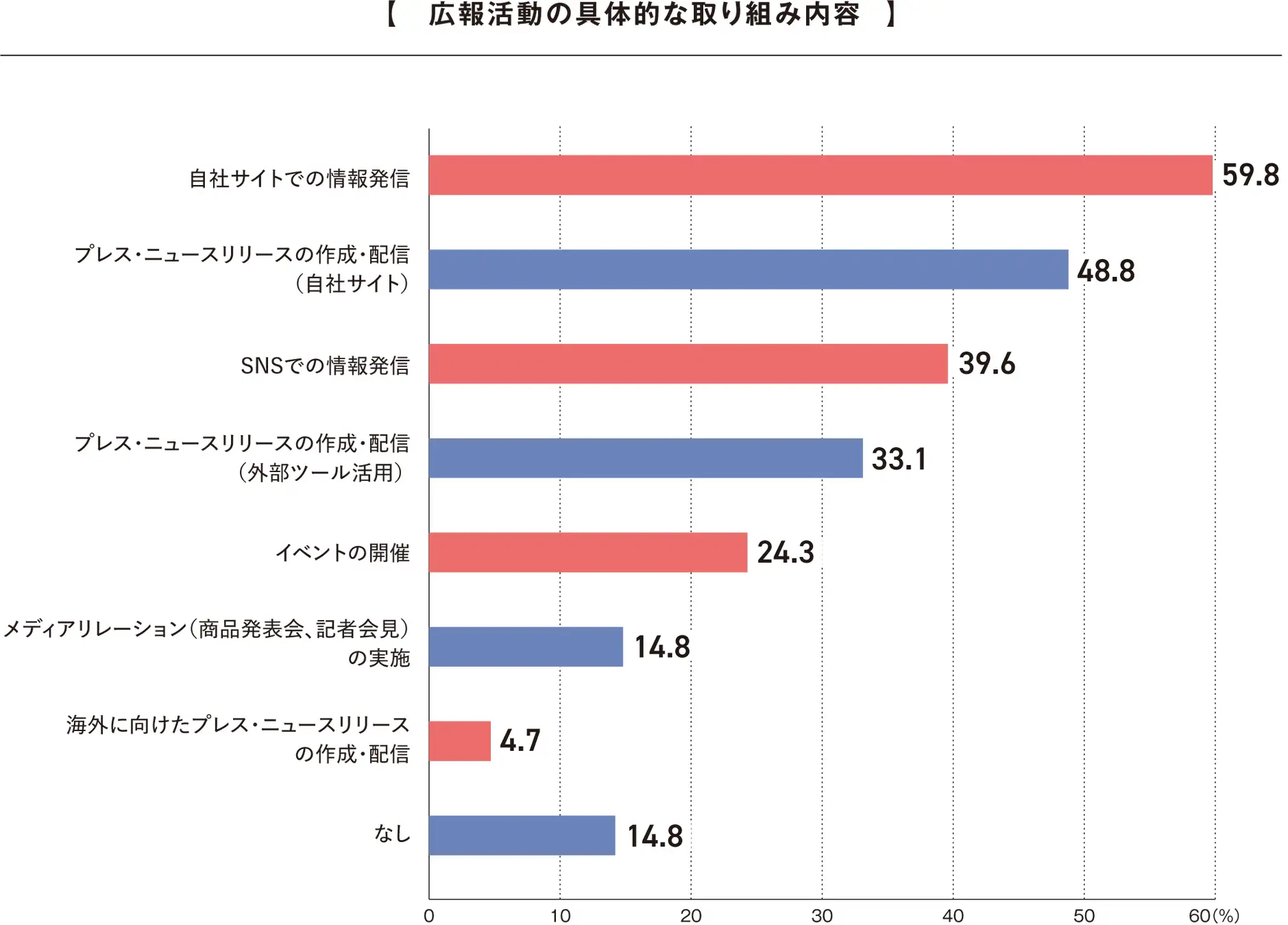 最後に広報活動の具体的な取り組み内容について聞くと、「自社サイトでの情報発信」が59.8%と最多となり、ついで「自社サイトでのプレス・ニュースリリースの作成・配信」が48.8%と続いた。その一方で、海外向けの発信は4.7%にとどまり、グローバル展開における課題が浮き彫りになった。