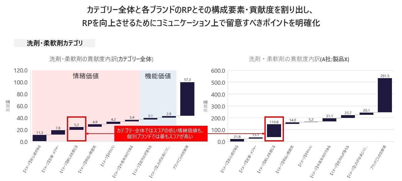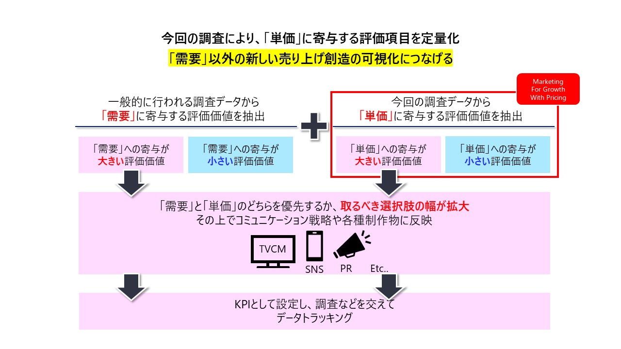 「洗剤・柔軟剤」「ヘアケア」「アイスクリーム」「ビール」の4つのカテゴリーで独自調査を実施。消費者の「頭の中の価格イメージ」と「購入実態」を分析した。これによって顧客が自社の商品やサービスの現在の立ち位置や、同価格帯の商品群における優位性を把握する「価格戦略策定の手法」を独自に構築した。調査結果を踏まえて「単価」に寄与する評価項目を定量化し、「需要」以外の新しい売り上げ創造を支援する。