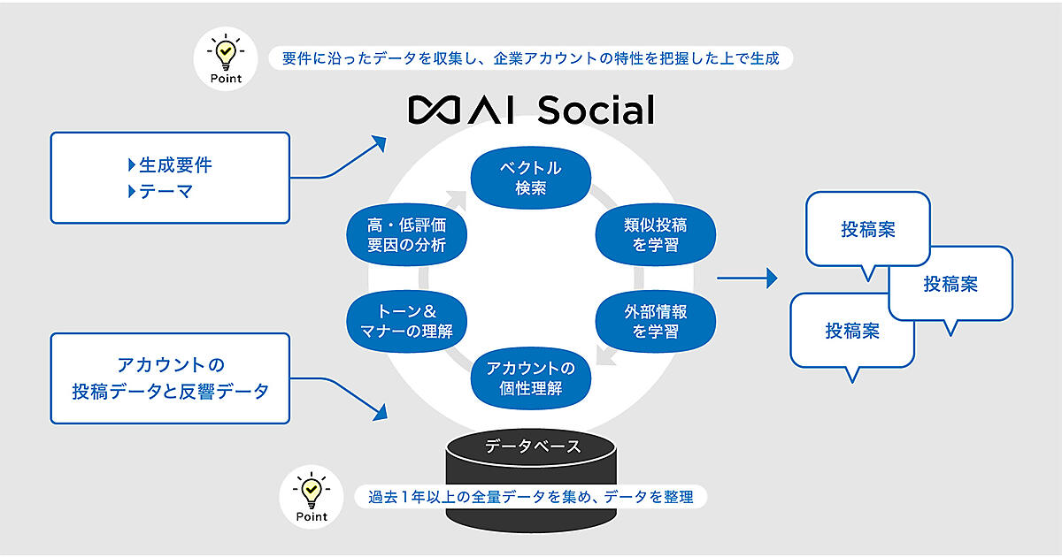 企業やブランド、サービスのX公式アカウントの許諾を得て、過去1年以上の投稿を学習する。投稿のバリエーション分けや特徴のラベリング、いいね数、リポスト数、保存数などの実績から成果の高い投稿と低い投稿をAIが精査し、アカウント特有の世界観や文章表現、絵文字の利用方法などアイデンティティを反映した投稿案を生成する。