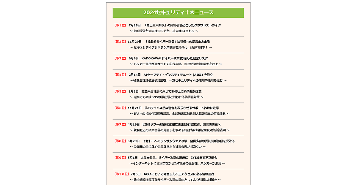2024年の十大ニュースとしては「クラウドストライクの障害」が1位となった。影響受けた端末は850万台、損失は54億ドルで、多くの航空会社、医療機関、放送メディア、小売業、金融機関などで、業務が停止する事態となった。