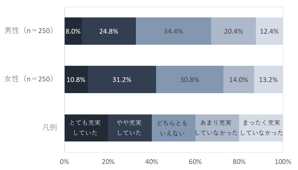 男女別では、「とても充実していた+やや充実していた」が男性32.8%に対して、女性42.0%と、前年同様に男性は女性を下回った。