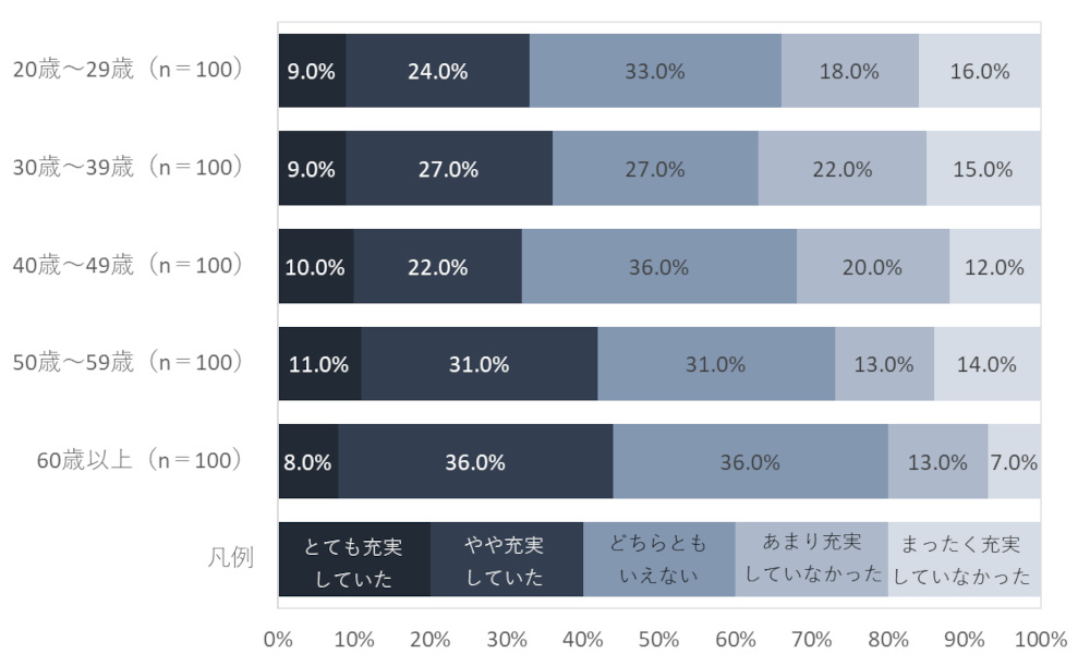 年代別では「とても充実していた+やや充実していた」がもっとも多かったのは60歳以上(44.0%)。1つ下の世代の50代も42%と高い。逆に「まったく充実していなかった+あまり充実していなかった」は、30代37%、20代34%が高い。
