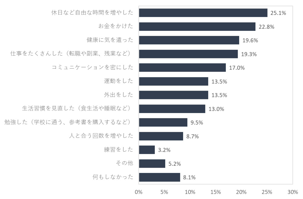 「2024年1年間を充実させるためにしたこと」を聞くと、「休日など自由な時間を増やした」25.1%、「お金をかけた」22.8%、「健康に気を遣った」19.6%、「仕事をたくさんした(転職や副業、残業など)」19.3%などが上位だった。趣味や自己啓発への欲求が高まっており、それに時間やお金をかけた人が多いようだ。