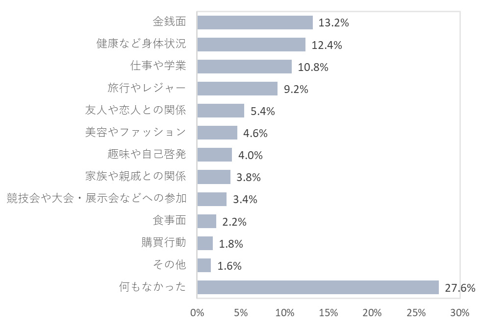 逆に「2024年1年間でもっとも充実していなかったこと」は、「何もなかった」27.6%で最多だが、「金銭面」13.2%、「健康など身体状況」12.4%、「仕事や学業」10.8%などがそれに続いた。