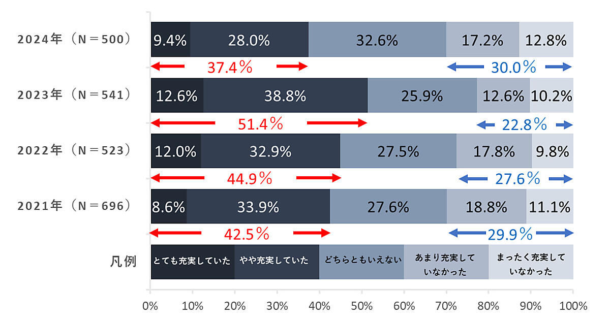 対して「どちらともいえない」は6.7ポイント増の32.6%、「あまり充実していなかった+まったく充実していなかった」は7.2ポイント増の30.0%だった。