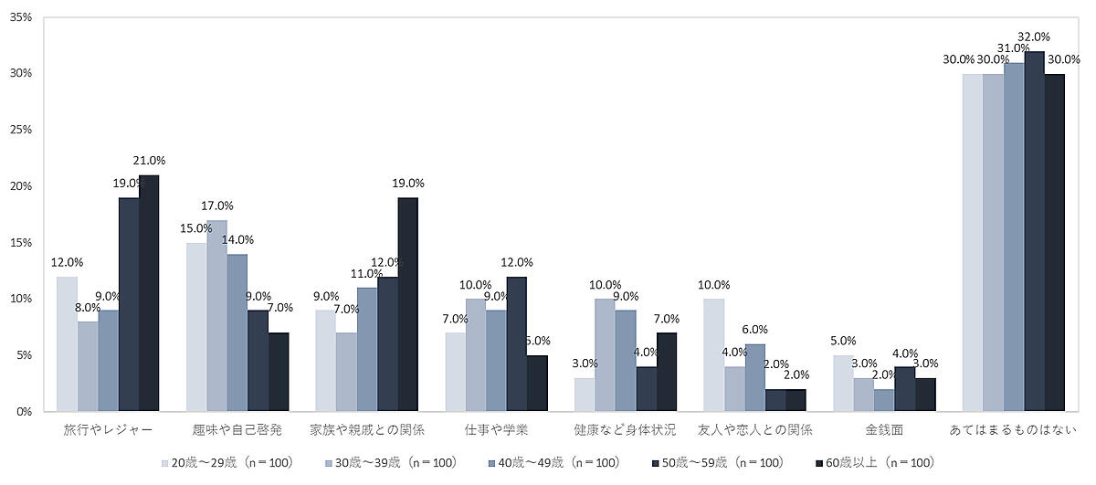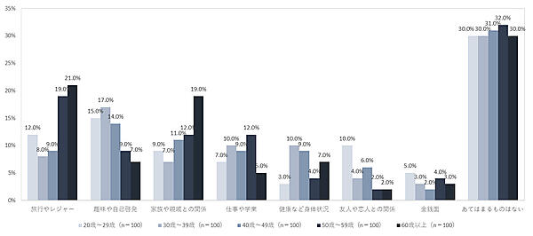 年代別では、50代~60歳以上では「旅行やレジャー」、20代~40代では「趣味や自己啓発」が高い傾向が見られた。
